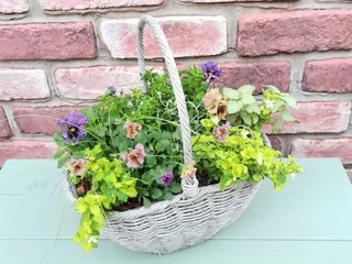 NEW 寄せ植え「レディ&マイガール」の変化💜 この寄せ植えを作ったのは11月半ばでした。レディとマイガールを植えたらかわいいだろうなあと思い購入した白いかごに、レディ2株とマイガール1株に、ネメシア、斑入りバコパ、ラミウム、カレックスを合わせました。11月の様子後方に植えたネメシアは、ホームセンターで花がまだ咲いていない株を買ったのですが、なか