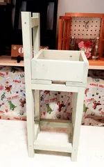 ワークショップ新宮店004はじめてのDIY編 チェア型ミディアムガーデンスタンドを作りました😊 今回学んだことは、①仮穴を開けるときにまっすぐあけなかったときの失敗体験。そして、修整のテクニック②足場ががたついたときの調整 そして、筋肉痛になりそうな力業からの、がたつき解決。 ペンキ塗りも、他の方に迷惑がかからない
