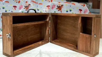 ワークショップ新宮店002はじめてのDIY編 2回目のワークショップで作ったトランク風小物ケース 前回は、のこぎりと慣れない電動ドライバーやスポンジペンキ塗りを使ったので筋肉痛になりました😁 今回は、のこぎりを使わない電動ドライバーを使う作業でした。 木の節の部分はコツをつかむまでまだまだ時間かかりますが、今回も楽