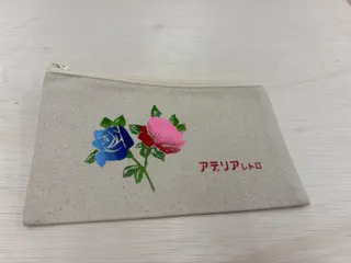 既成のポーチに好きな色を重ねてデザイン シンプルそうに見えてどの柄にしようかどの色をどう使おうか案外悩むものです 布用絵の具は初めて使った 最終的にいい感じに仕上がって満足 しかしこの日参加の方々もそれまでアデリアレトロ知らなかった人ばかりでしたね……!(´▽