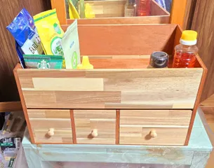 NEW コーヒーと味噌汁とその他収納棚☆ ■作品内容アカシア集成材が可愛すぎて作ったドリップコーヒーとフリーズドライ味噌汁を収納する引き出し付き収納棚です。■こだわりポイント棚を作る目的よりアカシア集成材を使って何か作りたい方が勝った作品です(笑)。ウチで消費量の多いドリップコーヒーのパックとアマノフーズのフリーズドライ味噌汁が収納できる棚