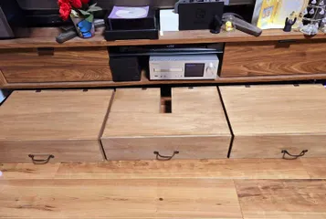 NEW テレビ台下収納☆ ■作品内容テレビ台下に隙間があって勿体ないので収納を作りました!■こだわりポイントカインズでベニヤや桐板を購入して作りました。取っ手は100均。テレビ台の色とウォルナット(カインズで購入:木部保護塗料)が良い感じに馴染みました(*´ω`*)3つ同じサイズで作ったら、まさかの真ん中にもテレビ台の支柱が
