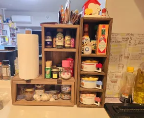 NEW ペーパースタンド付き収納棚と調味料棚☆ ■作品内容ペーパースタンド付収納棚(カインズワークショップ)と並べて置ける調味料棚を作りました☆■こだわりポイントお気に入りのこげぱんの蓋付き陶器カップを砂糖・塩・片栗粉入れにしてずっと使っていて、これが収納できる棚を作りたいなと思って、以前ワークショップで作ったペーパースタンド付き収納棚と並べて置