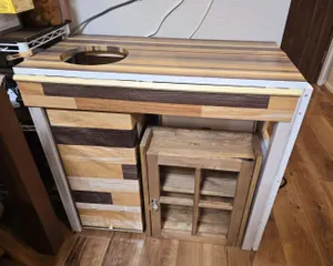 NEW ゴミ箱隠しついでに台にしちゃった☆ ■作品内容ゴミ箱(蓋なし)と中身が見えるのが嫌で(笑)隠しつつゴミを投げ込みやすい箱作るついでに色々置けるように台にしちゃえーいと作りました\(^o^)/■こだわりポイントカインズで天板と足用のホワイトウッド垂木を買って、天板はワークスペースで糸鋸で丸くくりぬきました。木目シートはネット購入と100