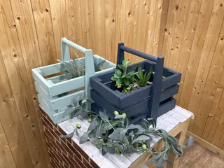 ガーデンバスケット 色の違いが写真ではあまり伝わらない…😅ガーデンバスケットを作成しました😆超撥水塗料ブラウン、ウォルナットで塗装しました。手前は弟夫婦へのプレゼント。最近ガーデニングにはまっていると聞いたので🤭少しステンシルもしました。 喜んでくれるといいなぁ🥰