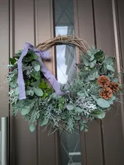 ナチュラルリース ■作品内容ユーカリやグレビレリアを使った🌿フレッシュなナチュラルリース🍀■こだわりポイントいろいろな種類の材料をバランスよくボリュームをつけながらリースにしていくのが難しかったのですが、出来上がりの香りに癒されました😊💕リボンは少しハロウィン🎃を意識してパープルで🤭ユーカリグレビレリアアサギリソウブ