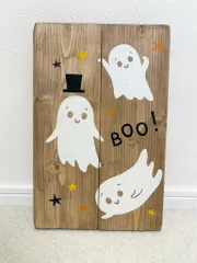 B&B Boo Ghosts B&BのタイニーサインボードのWSに参加しました デザインは毎回季節先どりを意識して選んでいます😌 ベースはウォルナット、オバケはオフホワイト、帽子と文字はブラック、星はレッド+イエローとブルー+レッドとイエローで仕上げました いつもはあまりダメージ加工をするこ