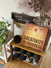 ミニサインボード「想像力発揮中」 ウチの玄関ホールです😃お出かけする時、帰って来る時などなど目に入る機会が多い場所私の好きな物を飾ってます💕 ⬇️枠ありで作ったミニサインボードの上に置いてます👍