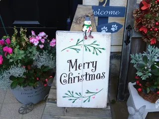 タイニーサインボード 今回B&B初参加しました☺️ シンプルに、優しい雰囲気で。下地作りが難しかったですがほぼイメージ通りに仕上がりました🥰 先日作ったリーススタンドに掛けて、玄関に飾りました✨ お店の飾り付けも素敵です😍 アドバイザーさんありがとうございました☺️🙇♀️また参加