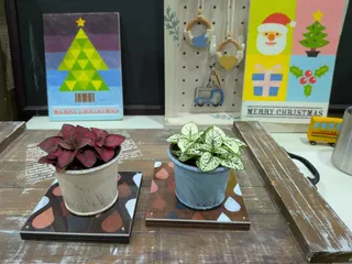 ■作品内容アクリル絵の具を使用して、しずくのステンシルをポンポンと🤗ゴールドの釘がとても素敵で、クリスマスを彩るめっちゃ可愛いコースターになって嬉しいです✨ ■工夫ポイント2枚のコースターに同色を併用して、トリュフに見立てたところです☕ グリーンを飾っても素敵ですね✨️
