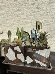 多肉植物・サボテン・ロボの共存?! 先月のWS(横長プランターとサボテンの寄せ植え)に参加してから、今まであまり興味がなかったサボテンが急に気になる存在となりました園芸店に行ってはお値打ちな面白そうな形のサボテンを購入していました。この度、伸び切った多肉植物とサボテンの寄せ植えを試みました。ついでに?!先日の移動WSで作った端材ロボ(