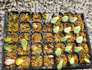 葉挿しの子たち ■作品内容夏に葉挿しした子達から可愛いお顔が出てきました1枚目の写真もよく見ると~😊■工夫ポイント名前のわかるものには名前をつけてます