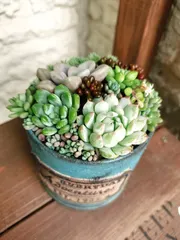 リメ缶に多肉寄せ ■作品内容 以前作成した太田胃散の薬缶に塗装し、セリアのワッペンを付けたリメ缶。違う多肉を植えていましたが☆になってしまったので新たに寄せ直しました💕