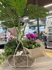 ガーデンシクラメンの寄せ植え カインズ伊勢崎で寄せ植えしてきました小さいカゴにシクラメン、カルーナ、バコパをバランスよく植えるのは大変でした スタッフの方のアドバイスで綺麗にできました