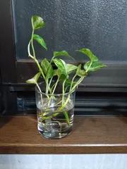ポトスの水栽培 鉢植えのポトスが伸び切って、変な形になっていたので、思い切って茎を切り水栽培をしました‼️いい具合に伸びて葉も出てきたので、植え替えるか、まだこのままでいくか検討中です✨本当に、ポトスは強いです😊