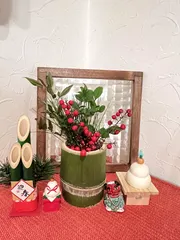 ■作品内容門松を作った残りの竹🎋で、花瓶にしました! ■工夫ポイント多肉の門松はリビングのエアコンの効いた暖かい部屋に置くとあっという間に徒長してしまうので、門松を作った残りの竹を使って、余った松葉や南天をいけて、100均のお飾りを置いたら あっという間にお正月コーナーが出来ました♪