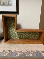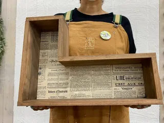 L型シェルフ 今日はこちらを。壁紙選べて、自分好みに出来上がり♡ウォルナットで塗り塗り…今日も楽しい時間をありがとうございました🙇♀もうひとつ作りたいので、予約しないとー🤗