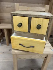 小物収納ボックス 小物収納ボックスを作ってきました〜塗料は何にしようかな〜と考えて、以前に1度使ったことのあるブライワックスを使いました。塗った後に乾拭きを一生懸命したら、ツルツルになりました。家具みたいです。引き出しはパインを使いました。上の取ってはセリアで購入した物です。なんだか顔😃みたいに見えますね😆「BRIW