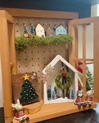 ■作品内容窓型ウォールラックの上部にクリスマスの街並みを作りました🏡🎄最初はこの様に飾ってたのですが、どうにも上部がさみしいな…と。⬇️そこで、端材でお家を作り飾り付けをしました🏡置いただけですけど、なんとなくまとまったように思います☺️ ■工夫ポイント下記のツリーが主役なので、全体の雰囲