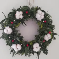 フレッシュグリーンを使ったXmasリースです。部屋中に香りが広がっています! ヒムロスギユーカリブルーアイスクジャクヒバコットン赤い実の飾りパールの飾り