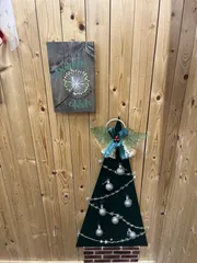 ミニサインボード🖼️をリーススタンドに置き玄関に飾りました✨家で雪の結晶ステンシル❄️✨追加し、頑張って作ったゴールドの文字には、キラキラパウダーをまぶし、イルミネーションを演出✨🤩ただの汚れが点々とついてるみたい😅写真ではキラキラが映らなくて残念😭可愛くなったのよ〜✨✨