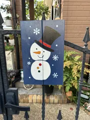 雪だるまのサインボードを作ってきました庭飾ろうと色合いを考えてポップな感じに仕上げました😄🎶外に置くのでニスを塗りここが定位置に🩷とても可愛い❤️です😄