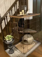 キャットゲージ🐈⬛ 猫ちゃんのゲージ^ ^リノベーション💕ホームセンターで買った普通のゲージです(^^)v 縁の所に本当は何に使うかわからないのですが L字の木製物❓❓をワイヤーで止め 百均のコルクボードを抜き 盆栽用のアルミワイヤーでかざりを作りました^ ^
