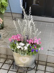 こんばんは! 今回は シクラメンビオラニベラサブラン を使って、ハート模様の入ったブリキの鉢に寄せ植えをしてみました💚 この鉢、結構大きめで使い道に困っていましたがやっと活躍の場ができました☺︎