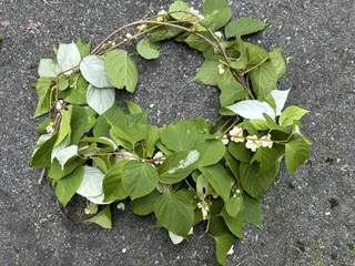 またたびのリース♪ フレッシュまたたびでリース♪ この時期は葉が白くなったりしてます。 白い花は枝から下を向いて隠れるように咲いています。 猫たちへのお土産、きっと大喜びです。