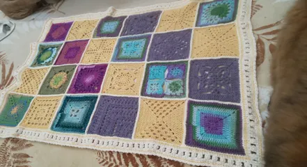 膝掛け(かぎ編みアドベント2025) クリスマスまで1枚づつ公開になるかぎ編みアドベント2025に途中より参加し編んでいました😅1月5日にやっとモチーフ編みが編み終わりhttps://diy-square.cainz.com/chats/h2dedpcyfrvetac0 モチーフが完成したら、同じ大きさになるように、型に合わせ