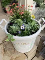 寄せ植えWS 行ってきました。ビオラかパンジーを選んだり、チューリップを選んだり、寄せ植えだけかと思いきや、その前に工程があり、サクサクとは行きませんでしたが、、モリモリにできました!左が私のですアイビー?が元気よすぎて後でカットしようかな。チューリップの植え方勉強になりました。7個の球根が埋まってます。長く楽し