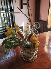 アイビー蔦を使ったかご編みのWSに、初めて参加しました🎵最初の編み始めを教えていただいたのですが、あとはお好きなように…ということで、初心者には一番難しいじゃありませんか😱💦思っていた形とは全く違ってしまったのですが、意外と気に入っています🎵安定させるために、リースを置いた上に置きます。壁とかに掛け