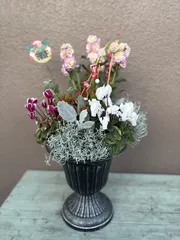 クリスマス〜迎春の寄植え ■作品内容ワークショップで作った寄植え。シクラメンが1個だと思って買って来たら、裏側にあったシクラメンも虫にやられてしまった😭■工夫ポイント今度は、丈夫な物を植えて、香りも楽しめるようにしました😊
