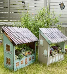 ハロウィンキャンペーン2022【波板を使ったプランター②】 WS作品の【波板を使ったプランター】何とかギリギリ2個目(右側)アレンジ完成✨〖1個目プランター〗秋モードの色合いになった多肉ちゃん達多めで入居して貰いました🏠💕両方ともWSでステイン塗料をベースに塗って、底穴も空けてあります🕳窓やドア、内側がステイン塗料の色そのままの部分です。左側の両脇の窓には、