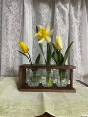 ホールソーで瓶ホルダー🌷 以前、母へのプレゼントに作った瓶ホルダーです🌼庭の花を挿してみたよ〜と連絡がありました📷ワークショップに参加するようになり、作った作品で、母も喜んでくれて嬉しいです☺️