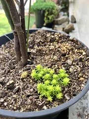 いつのまに⁉️ ミモザアカシアの鉢に可愛いセダムがいっぱい💕このまま増やして寄せ植えに使えるね❣️😊
