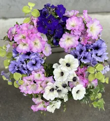 ワイヤーリースのワークショップに 参加してきました さくら餅さんとみんとさんと よく知ってるみなさんなので 最初から盛り上がりおしゃべりしつつも 誰1人手を止めずあっという間にリースが ペチュニアでゴー☆ジャスになりました 予定時間より早く 作品が仕上がりました 流石👍 &n