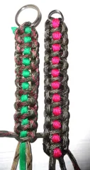 平編み その4 ↓ 平編みの応用です。 ベ-ジュを軸にします。茶色で平編みします。 図の様にセットします。 ↓ 緑を図の様に差し込み締めると 出発点になります。 緑は2本の軸の間