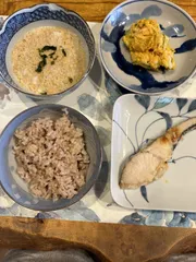ヘルシーな朝ごはん ■材料さわらの味噌付け、かぼちゃ、きゅうり、魚肉ソーセージ、山芋、刻み納豆、あおさ、玄米 ■作り方❶さわらの味噌漬けをクッキングシートを敷いたフライパンで弱火だじっくり焼く❷かぼちゃを湯掻いて、潰して、きゅうりと魚肉ソーセージを輪切りしたものを入れて、マヨネーズで和える❸刻み納豆に、山芋を