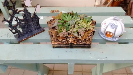 ハロウィンキャンペーン2022【多肉寄せ植えでハロウィン🎃】 フォトピクチャーに寄せ植えして、たたせようと頑張りましたが2回の失敗😵💧諦めてねかせて📷️