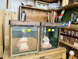 ようやく完成👍シーサー箱 前に片方だけ作っていたシーサー箱。ようやく二つ目完成しました!前のアクリル板を外した方が見えやすいですねw蓋が二つあり、一つ目の蓋にはソーラーライトをはめ込みました。二つ目の蓋にはアクリル板を打ち込みました。これで天気をあまり気にせず外に出せますし、ソーラーライトも充分に機能を果たしてくれると思いま