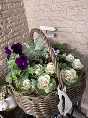可愛いカゴの寄せ植え ミニ葉牡丹 先週はじめて参加したGWSで作った葉牡丹の寄せ植え🪴花同士の高さ合わせや隙間への土入れであたふたしましたがなんとか完成しました😊寄せ植えした植物の管理方法も詳しく説明いただき勉強になりました📖春まで楽しめそうです💕