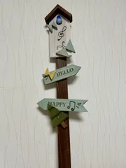 ふたつ目のサインピックは鳥さんにしました。蝶と木の色は家に帰ってから塗り直しました。ステンシルも今回は成功😆でした😄。ちょうど小さい鳥さんのパックがあったので、鳥の巣の入り口?に取り付けてみました。 お気に入りです。