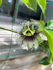 面白い花でしょ? パッションフルーツの花はこの一種類だけですが、 今日園芸店で花を愛でる「パッションフローラ」っていうの売ってました。 クレマチスみたいに色んな花の種類がありましたよ〜。
