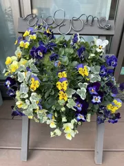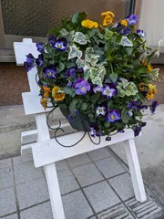 ハンギングバスケットが落ち着いたので♥ 先日、ハンギングバスケットを作成。なかなかビオラが落ち着かず🌀以前に作ったフラワースタンドに飾りました♥ めでたしかな笑