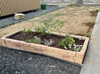 長男の家の庭づくり、まずはここから。 コンクリートでできたブロックを組み合わせて花壇を作りました。車を置いてない時は何もなくて😅寂しかったのですが、春になって球根の花が咲いたり、アナベルが伸びてくれば少し目隠しになるかな。 少し隙間ができたところ😥には後からモルタルで補修しようと思います。 &n