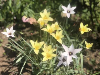 原種系チューリップ、クルシアナ。ユリ科というだけあってこの花もユリみたいな形。横から見ると赤いラインが見えて違う雰囲気。 寝てるところは赤が目立って中が黄色だか白だかよくわからないわね。先日咲いたレディジェーンもクルシアナのお仲間なんですって。よく似てるわね😊 こちらはライラ