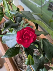 静かに 実家の庭に落ちていた椿の種 両親も亡くなり、処分するりことになってしまった実家母が大好きだった椿の根元に落ちていた種を持ち帰り、植木鉢に元気に育ち、2年半窓から部屋の中を覗いているかのように静かに咲いています胸が締め付けられます