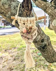 ハロウィンキャンペーン2022 初めてのマクラメ編み🪴 イベント🎪のwsで、マクラメ編みのドライフラワーのハンギングを作りました💕 秋風🍃の吹く中、お隣はカップルで参加🧶 マクラメの糸は柔らかくて触り心地よく、教わった編み方を覚えているうちに少しスピードアップ🆙で編み上げました🧶 ドライフラワーを飾って、しっぽを良い長さにカ