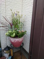 今日 よく行く園芸店のイベントで鉢持ち込みOk 土無料 店内フリーチョイス寄せ植え講習 がありました。鉢のイメージに合わせ アドバイザーさんが植物選びに相談乗ってくれて かわいい〜かわいい〜の連発で楽しく寄せ植えさせてもらえました。ラグラスバニーテールをメインにコルジリネとレースラベンダー 栄養系バ